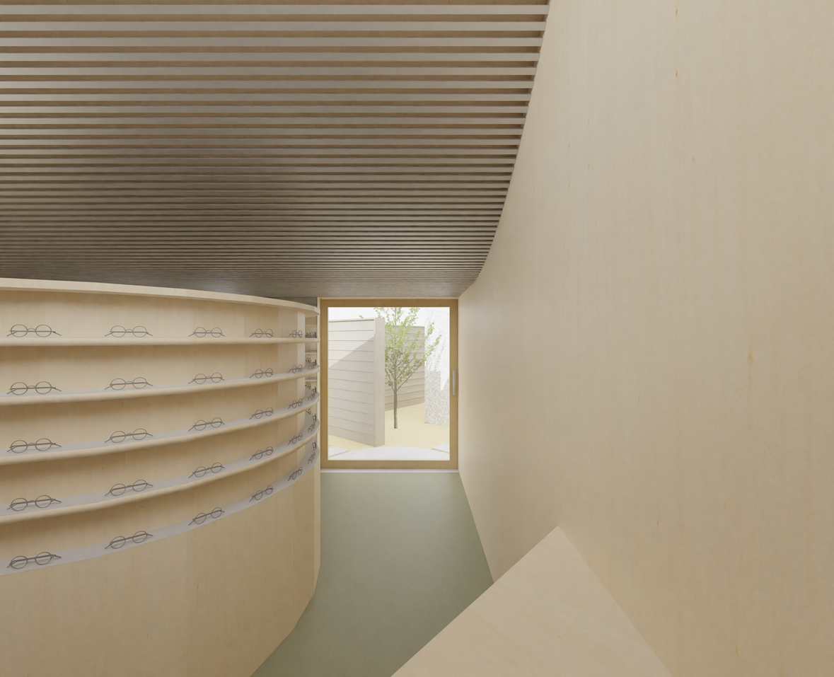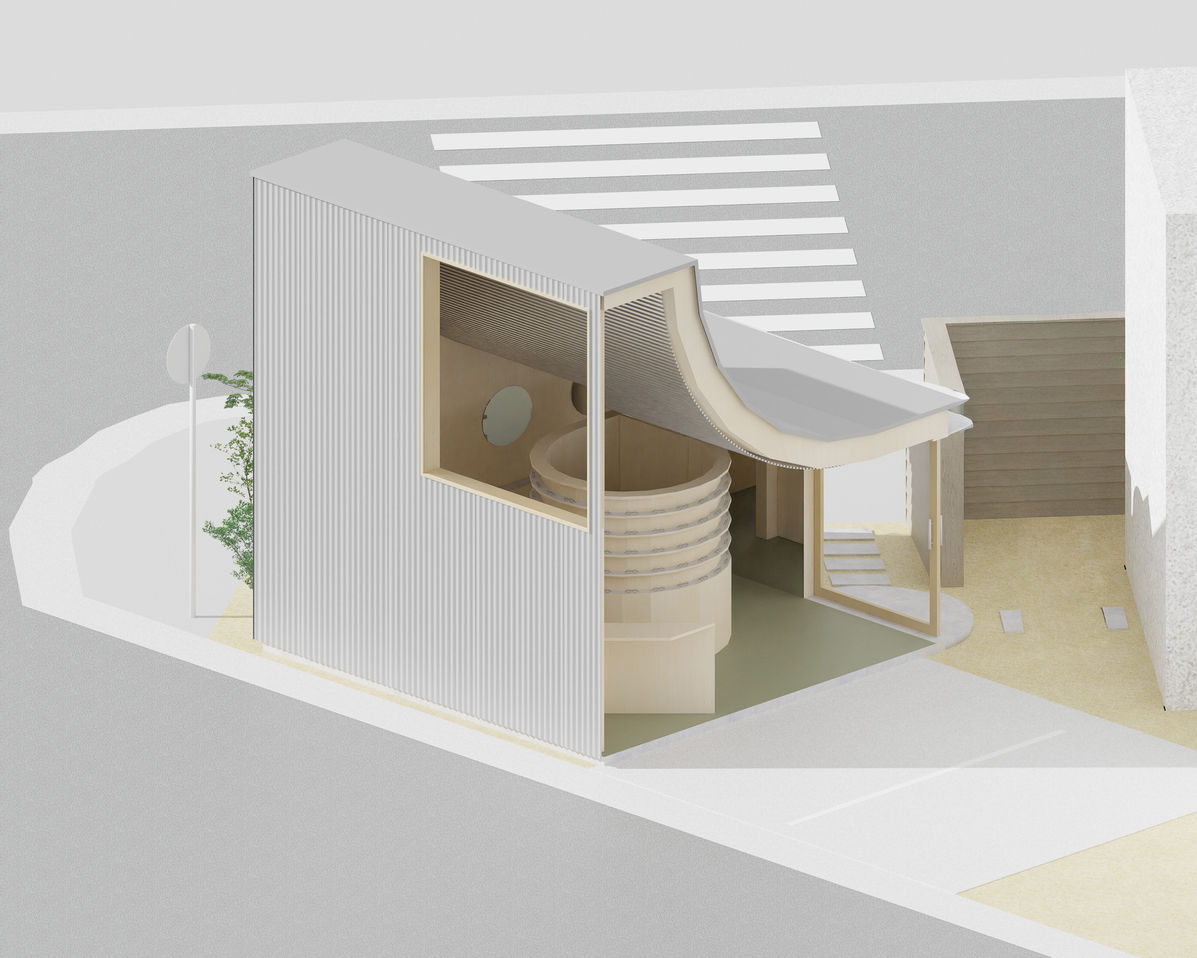 小さく細長い平面(約11m×3.6m)を、間口と奥行きという相反する二つの性質として読み替え、再構成した住宅。1階は間口を活かして街へ階層的に開く「縁」、2階は奥行きを活かして近隣の緑景を深く引き込む「洞」とし、対照的な二つの空間を上下に重ねた。さらに中央に大きな吹抜を設けることで、両者は緩やかに交差し、明快な対比は有機的で複雑な広がりへと変わる。外形的な制約を空間構成の起点として捉えることで、小さなフレームを超えた伸びやかな生活環境を目指した。