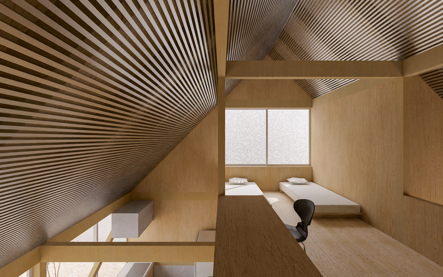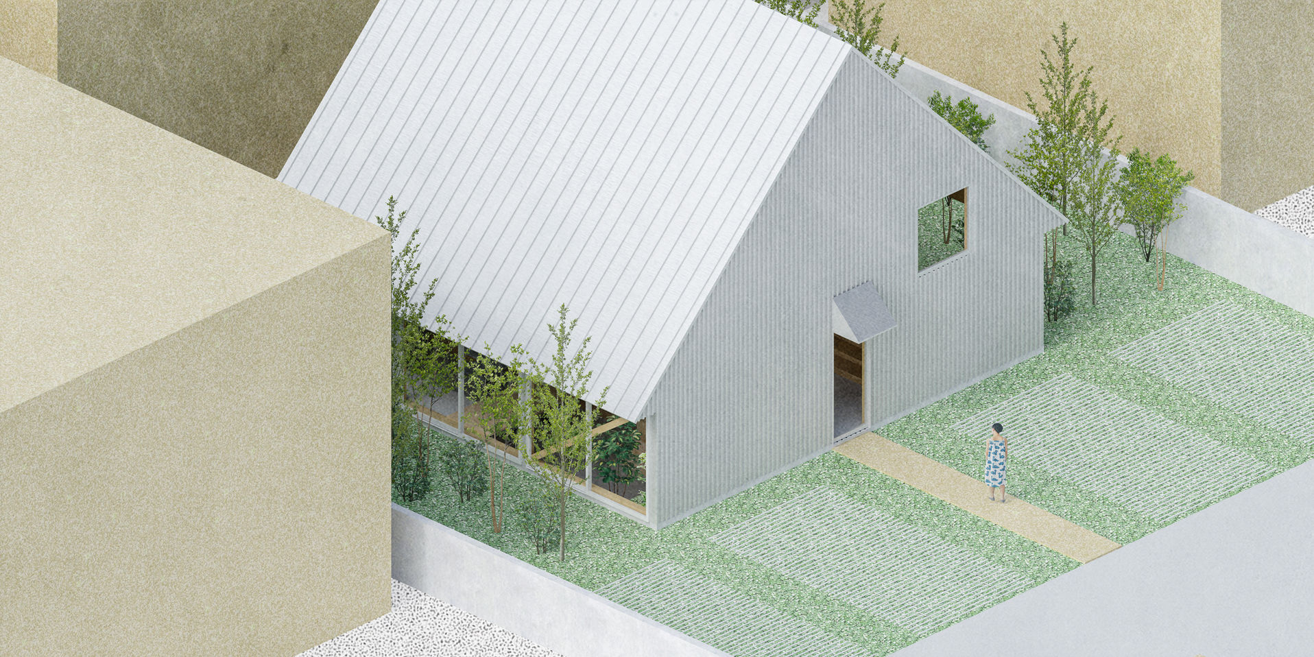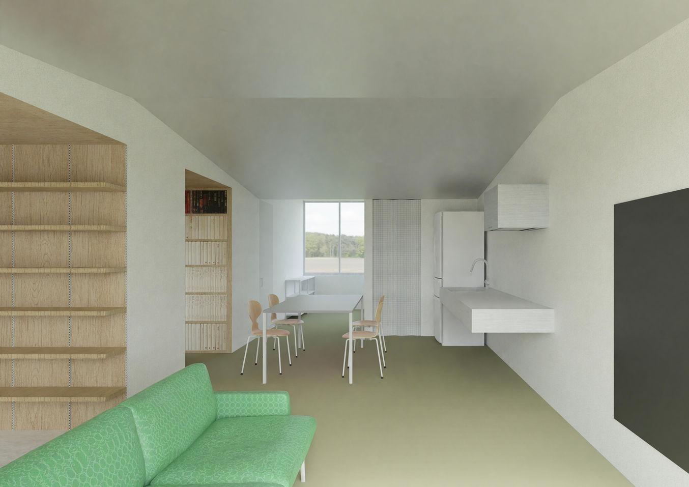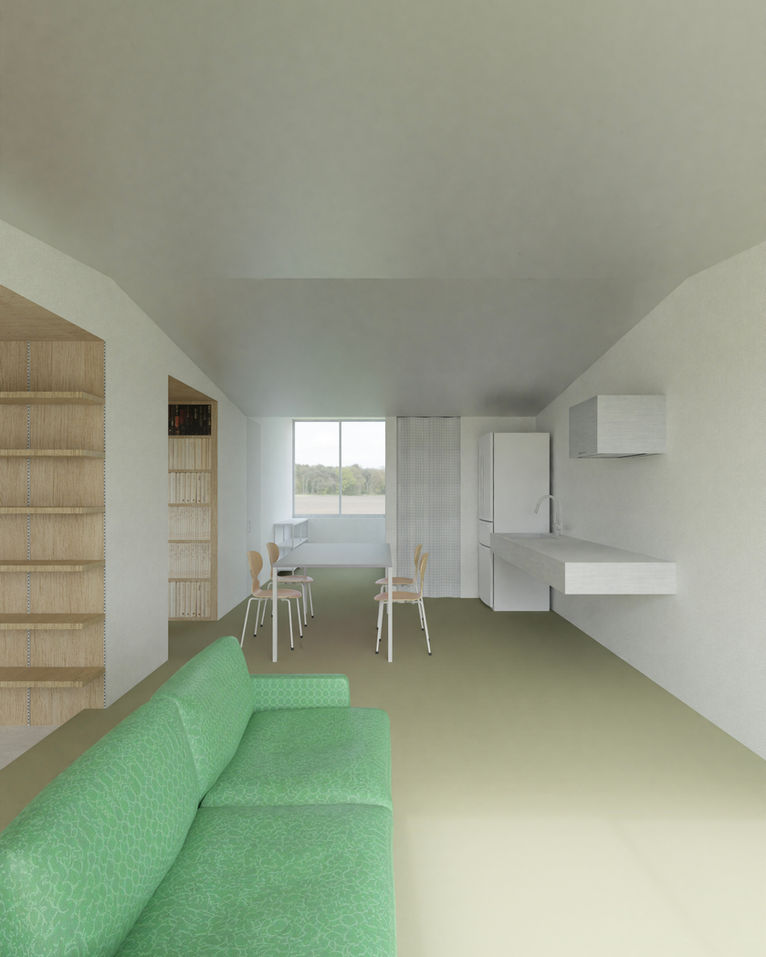 阿蘇外輪山の中腹に建つ、移住者向けに計画された賃貸住宅。敷地は、南阿蘇へと水平に広がる風景と、背後に迫り上がる外輪山という、対照的な二つの風景のあわいに位置している。水平に展開する風景と立ち上がる風景との釣り合いをかたちづくるように、45度勾配の屋根を採用した。二つの風景が拮抗するなかで、それらの関係が建築の経験を介して組み替えられ、新たな構造性を持った風景が生活の場として立ち上がることを期待した。
