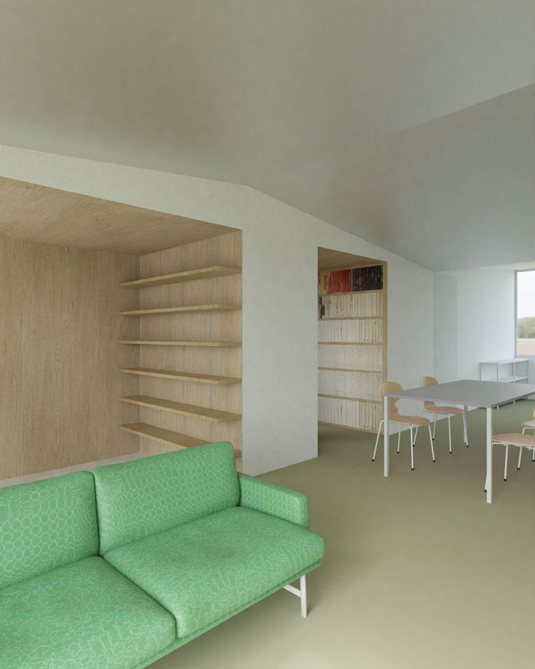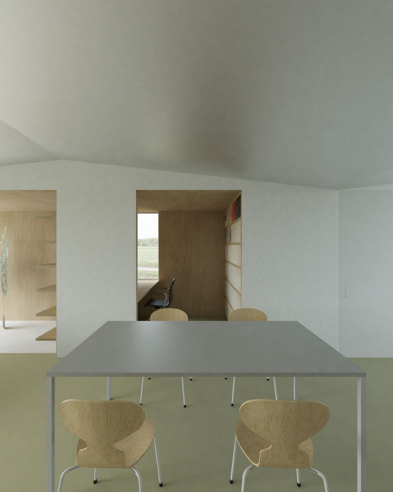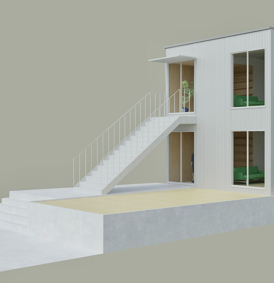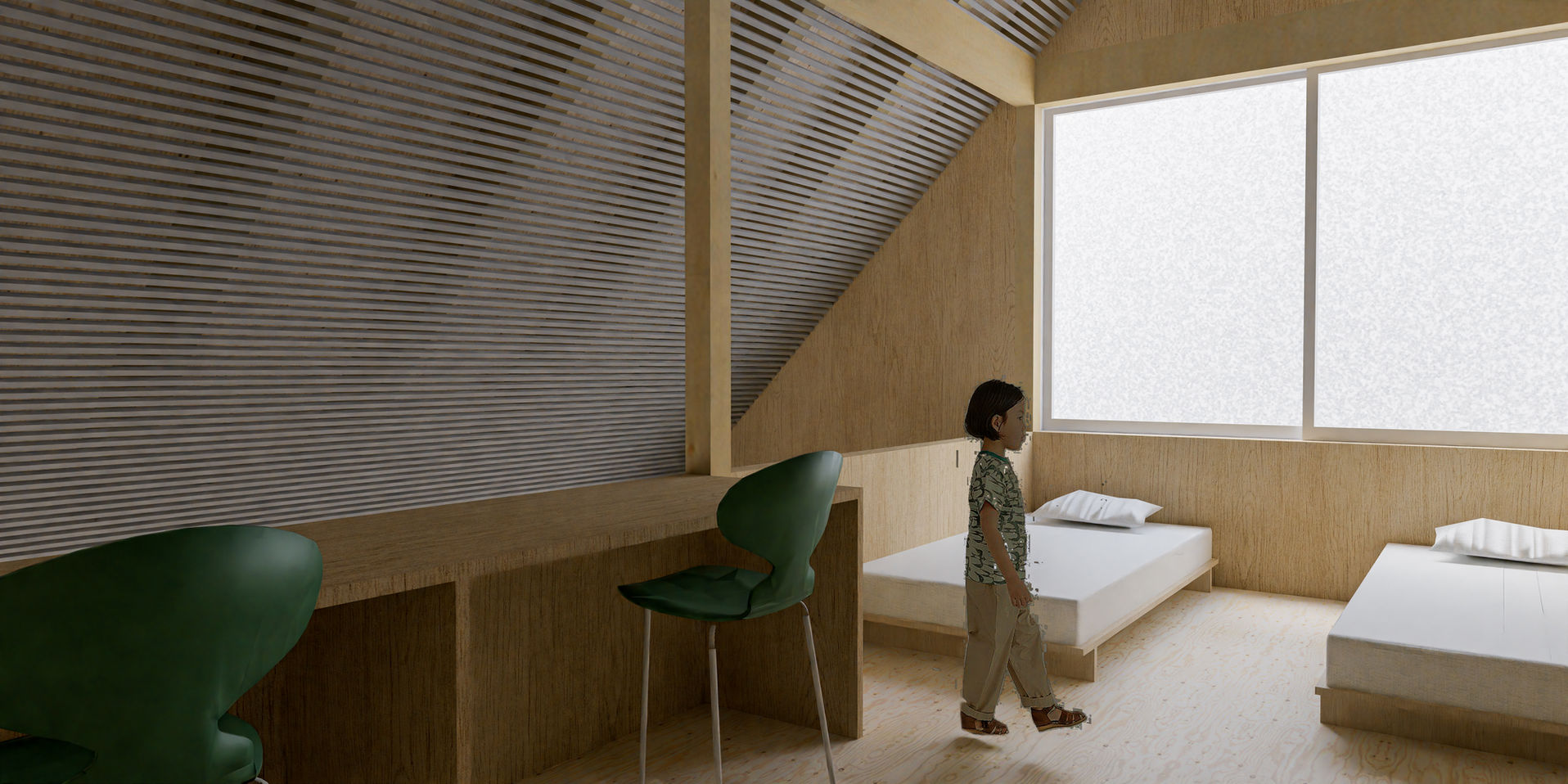 阿蘇外輪山の中腹に建つ、移住者向けに計画された賃貸住宅。敷地は、南阿蘇へと水平に広がる風景と、背後に迫り上がる外輪山という、対照的な二つの風景のあわいに位置している。水平に展開する風景と立ち上がる風景との釣り合いをかたちづくるように、45度勾配の屋根を採用した。二つの風景が拮抗するなかで、それらの関係が建築の経験を介して組み替えられ、新たな構造性を持った風景が生活の場として立ち上がることを期待した。