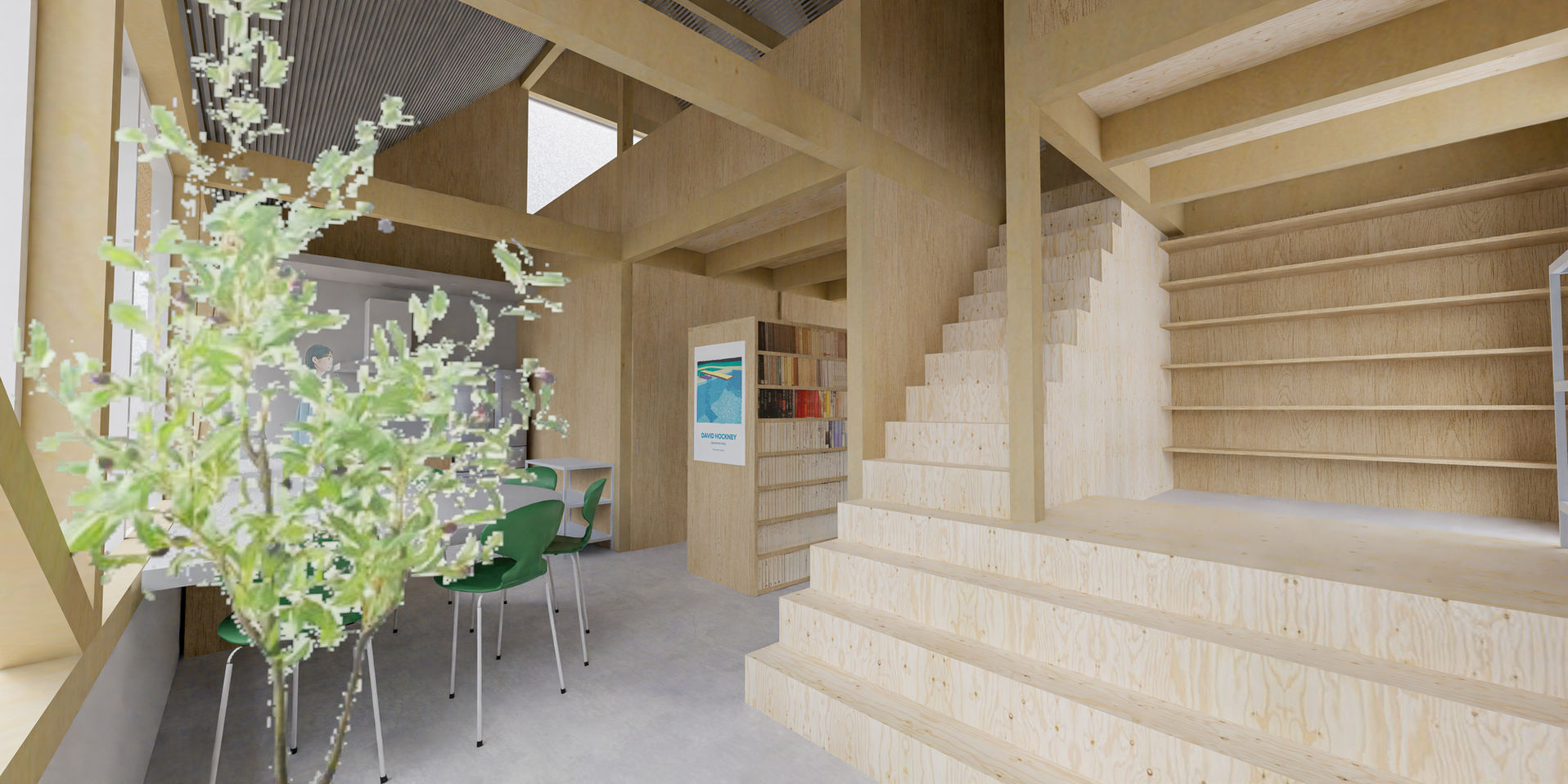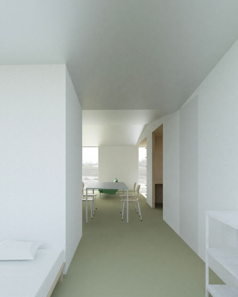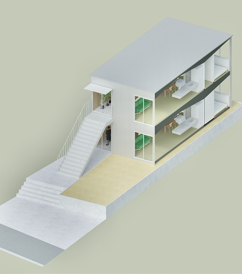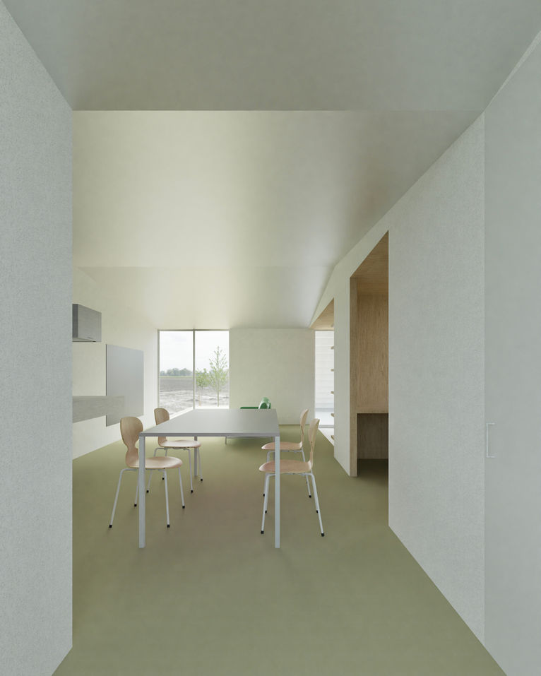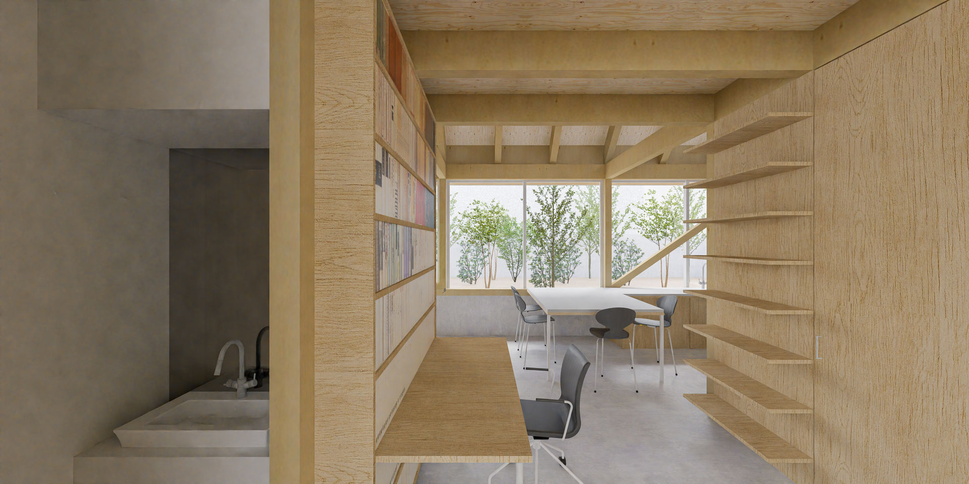 阿蘇外輪山の中腹に建つ、移住者向けに計画された賃貸住宅。敷地は、南阿蘇へと水平に広がる風景と、背後に迫り上がる外輪山という、対照的な二つの風景のあわいに位置している。水平に展開する風景と立ち上がる風景との釣り合いをかたちづくるように、45度勾配の屋根を採用した。二つの風景が拮抗するなかで、それらの関係が建築の経験を介して組み替えられ、新たな構造性を持った風景が生活の場として立ち上がることを期待した。