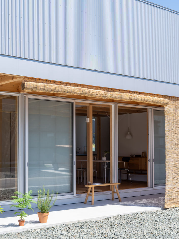 阿蘇外輪山の中腹に建つ、移住者向けに計画された賃貸住宅。敷地は、南阿蘇へと水平に広がる風景と、背後に迫り上がる外輪山という、対照的な二つの風景のあわいに位置している。水平に展開する風景と立ち上がる風景との釣り合いをかたちづくるように、45度勾配の屋根を採用した。二つの風景が拮抗するなかで、その関係が建築の経験の中で組み替えられ、ある種の構造性を持った新たな風景が生活の場として立ち上がることを期待した。