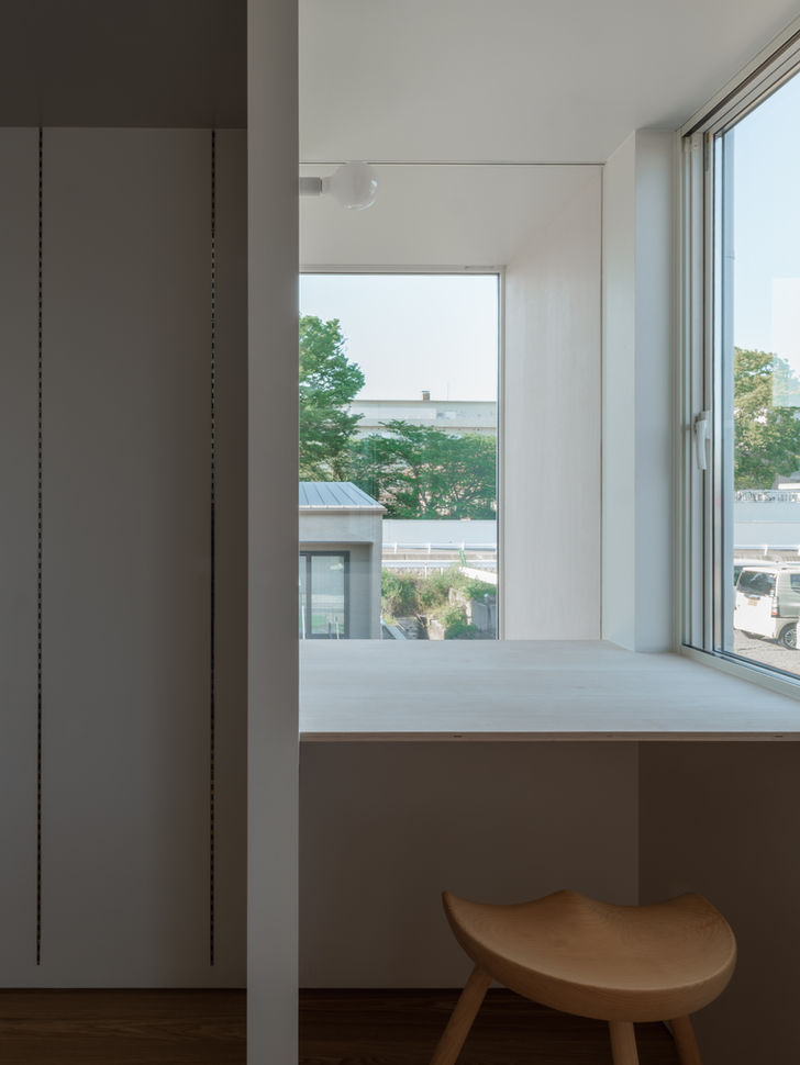 田畑と分譲地内の小さな開発公園という、二つの空地に面した住宅である。南側に広がる田園風景に対しては、目線の高さに水平連続窓を設け、東側の公園に対しては、利用者からの視線を避けながら空を大きく切り取り、たくさん光を取り込むハイサイドの水平連続窓を設けた。二本の水平連続窓は、周辺状況に応じて高さを変えながら、長大な立面に沿って巻き付いている。これらの水平窓による環境の翻訳は、平面的な開放性を超えた立体的で表情豊かなシークエンスを、生活の場にもたらしている。